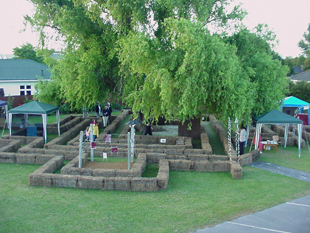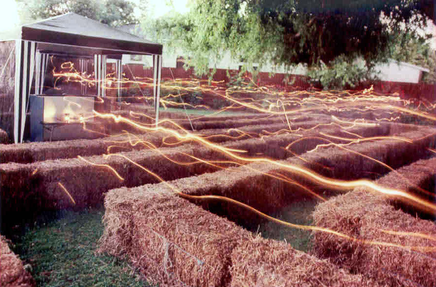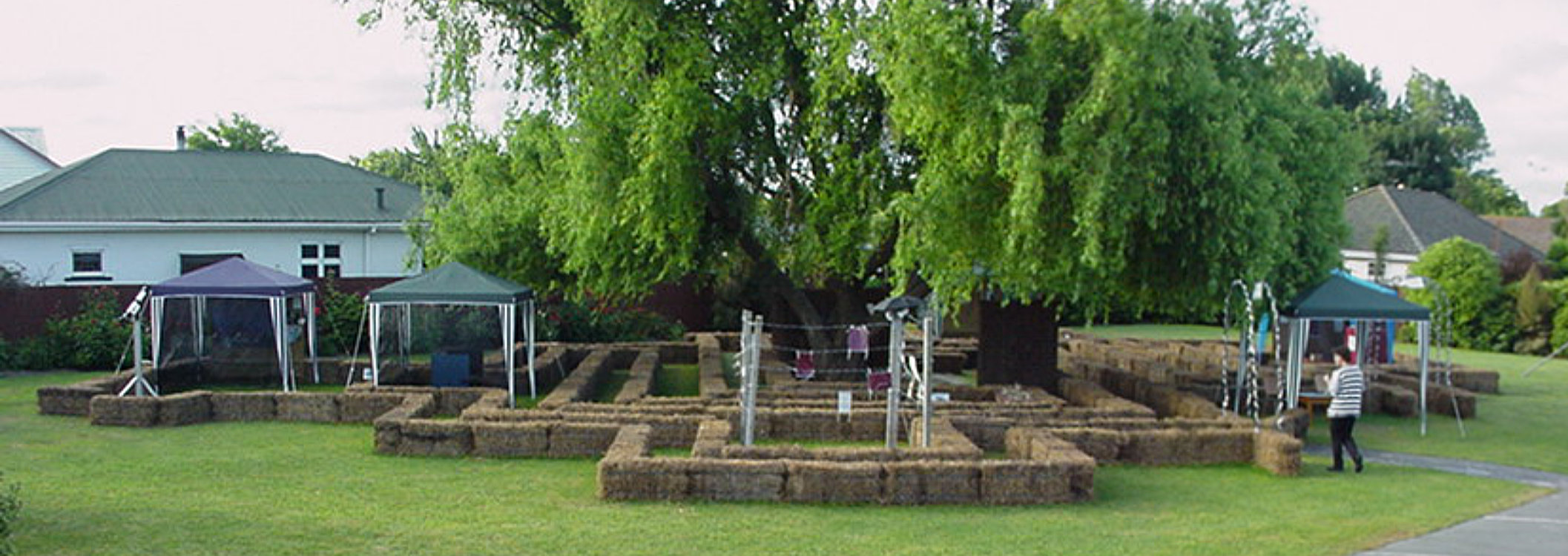 The labyrinth is the same pattern as the St. Pauls Cathedral labyrinth, but much larger and made with straw bales. The stations are entirely different. The entrance is on the right through the hoops. The visible stations are, from left, 'God of the universe' with telescope, 'Fragrant gifts', and 'Suffering of the innocents'. |