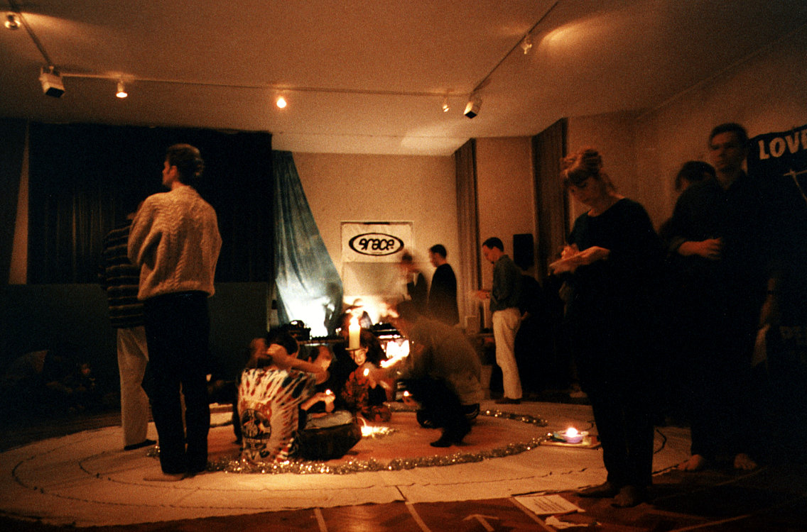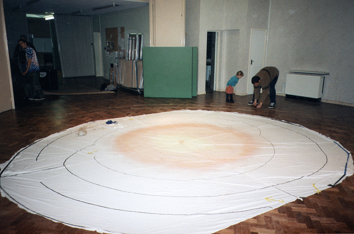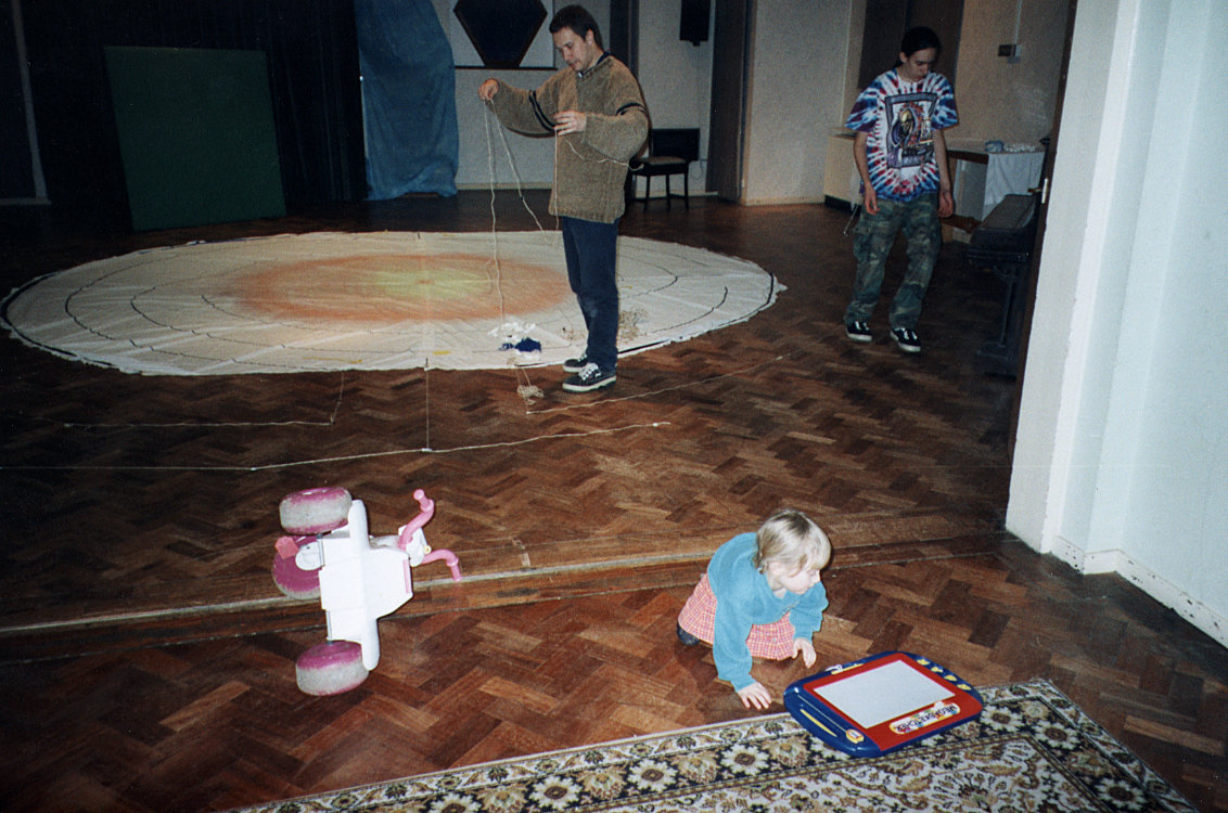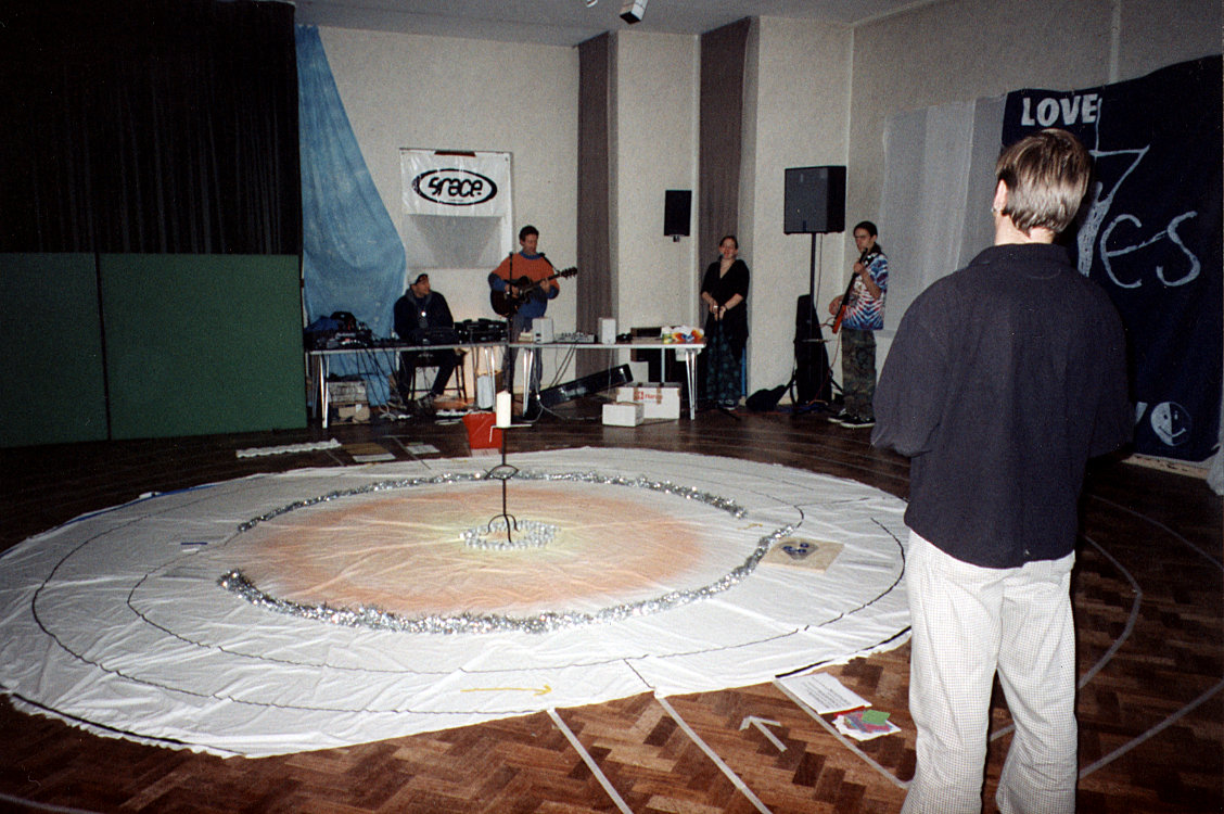 Christmas Labyrinth 1998, with Live On Planet Earth. LOPE had developed their labyrinth service in their previous church in Kent, and brought it to Grace in the late 90s when they moved to North London. This time the labyrinth was themed around the Annunciation and Advent. Above, marking out in the church hall. |