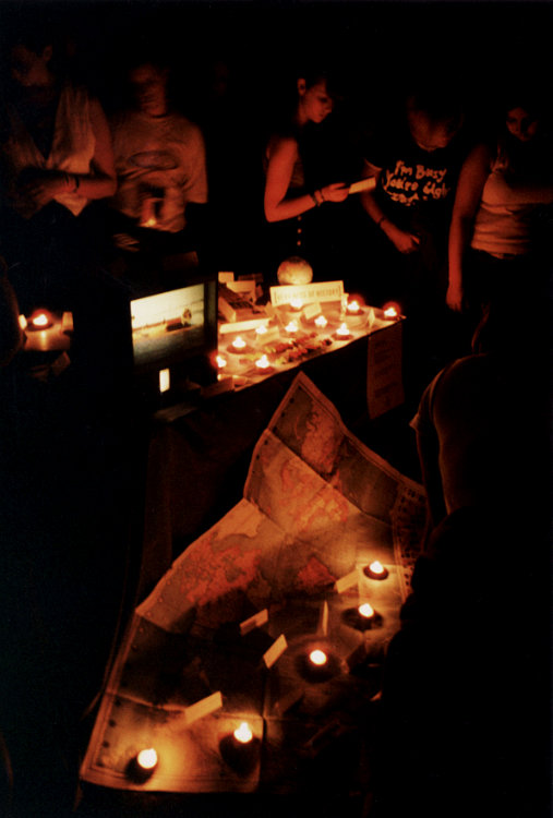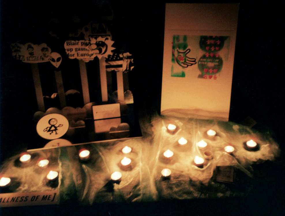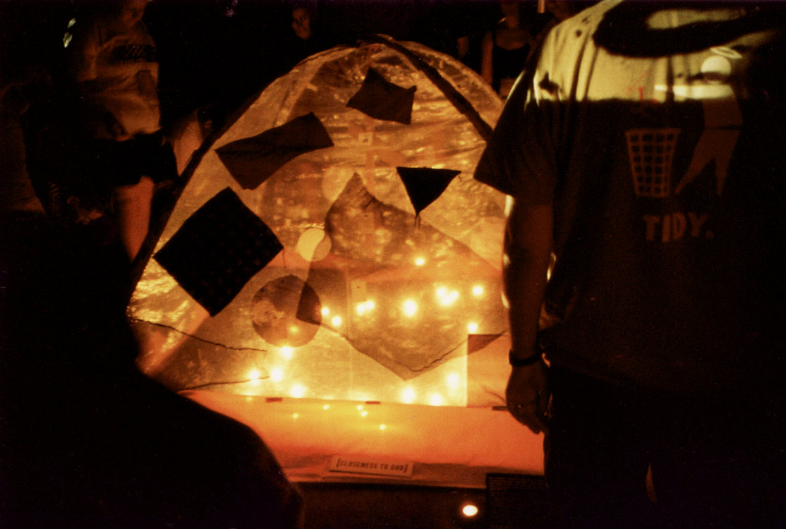 'Closeness to God'. In the top centre of the tent hangs a cross. We are invited to put a piece of material on the tent to show how close or far we feel from God. The material is opaque or translucent, so we may be close to God but unable to see God, or vice versa. |
