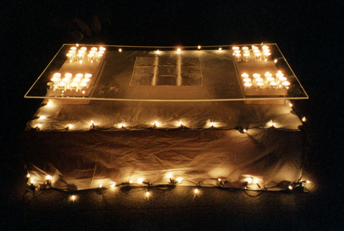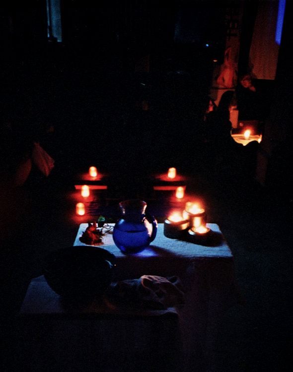 The altar. Amazing what can be done with Ikea video racks and a sheet of Perspex.