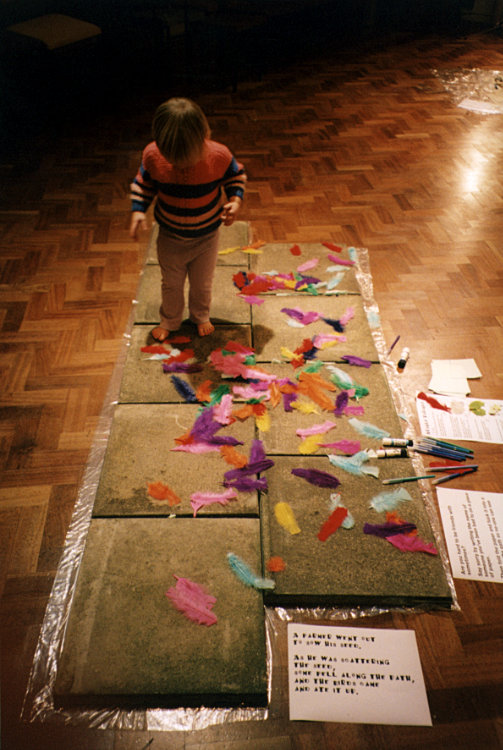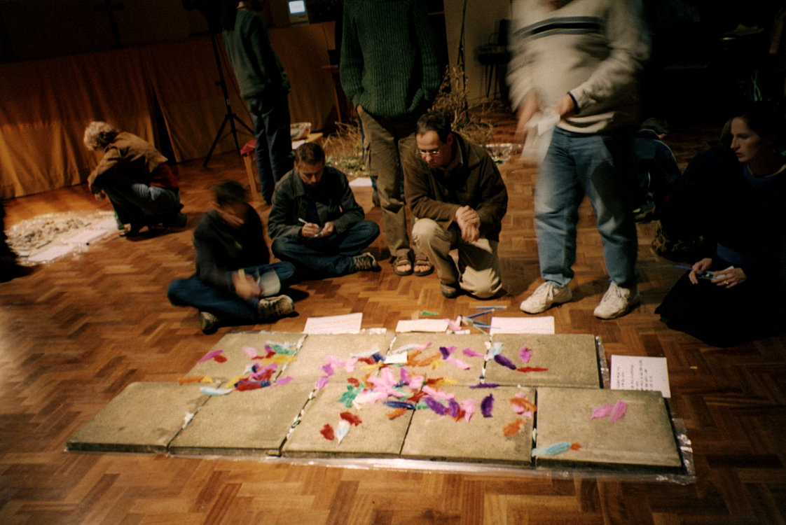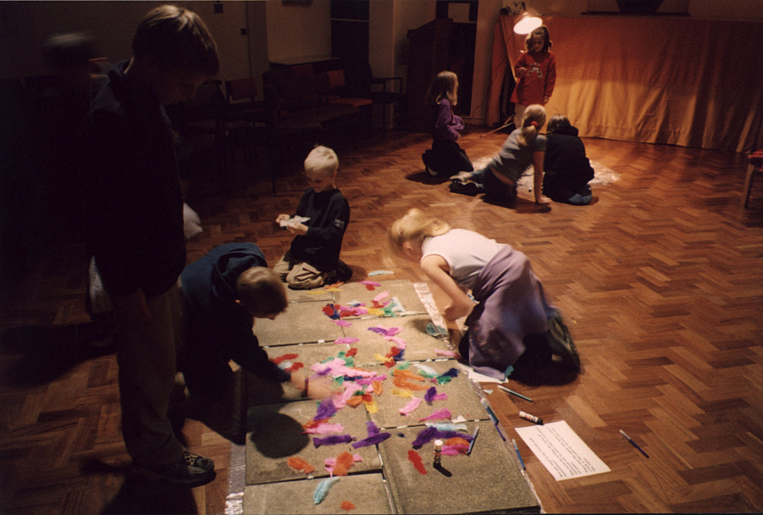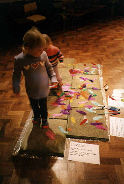 Children were given a card with the parable on, and at each station there was something to glue to it - a feather at the path, sand at the stones, a dead leaf, petals at the good soil. There were child versions of the instructions/meditations at each station. The intention was to change from child to adult versions at 8pm, but the children didn't go home and the adults liked the children's version so we ended up with both! |