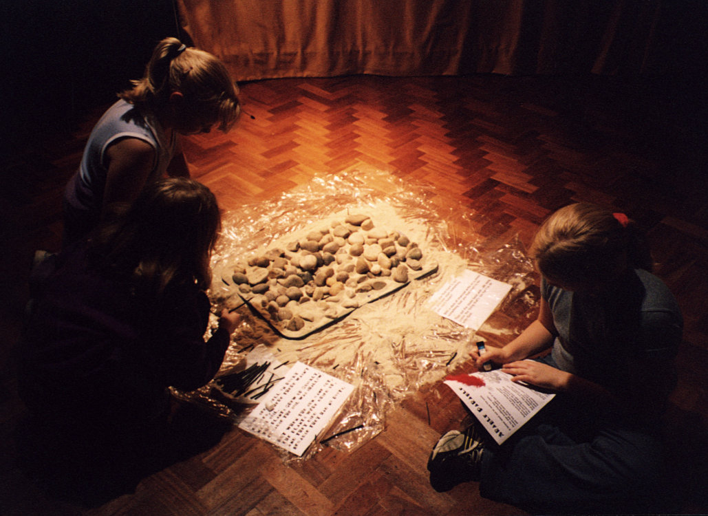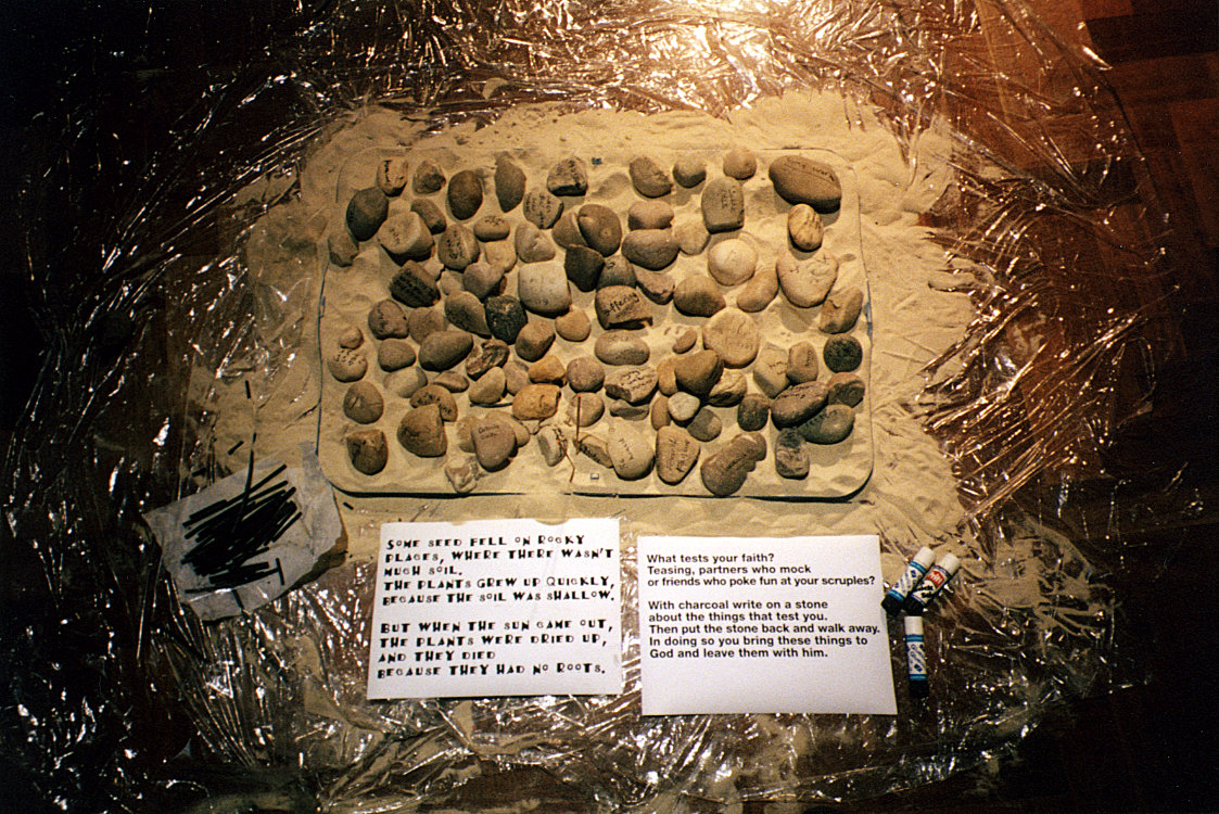 'Arable Parable' began as an installation based on the parable of the sower [Luke 8:5-15], created by Sanctuary for Greenbelt 2002. Grace borrowed the idea for a child-friendly 'harvest festival' service. There are four stations: the path, the stones, the thorns and the good soil. The service ran from 6pm to 10pm, with a cafe for socialising, and people could come and go in their own time. |