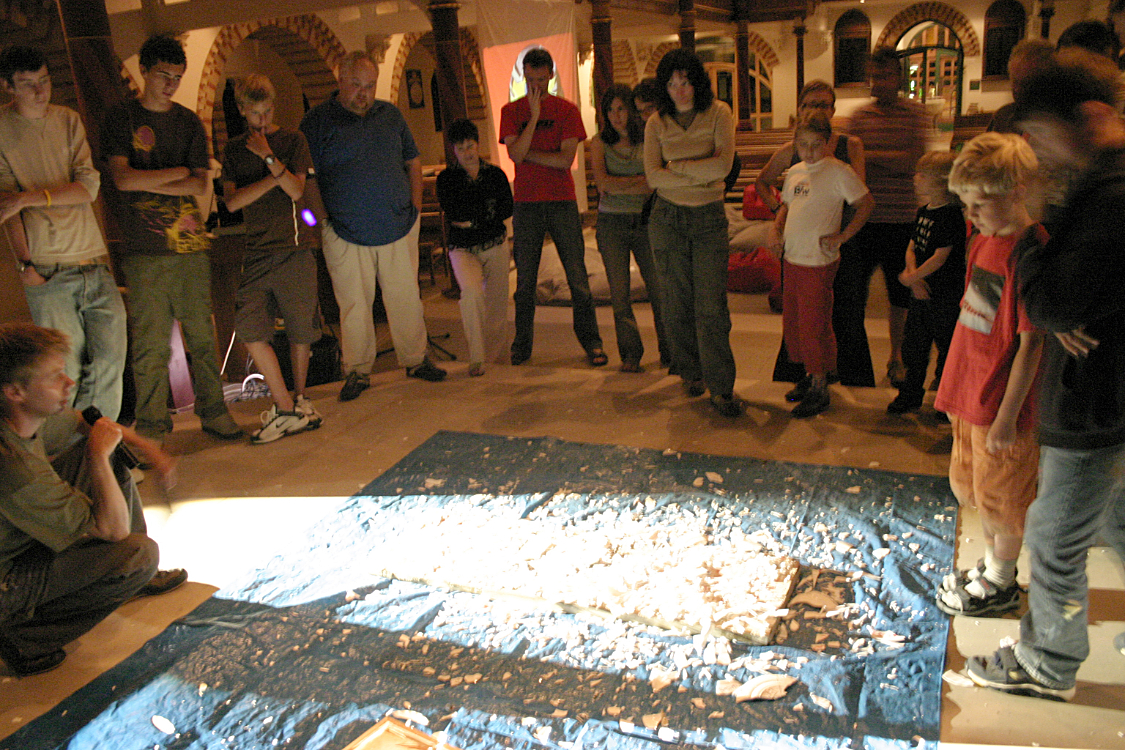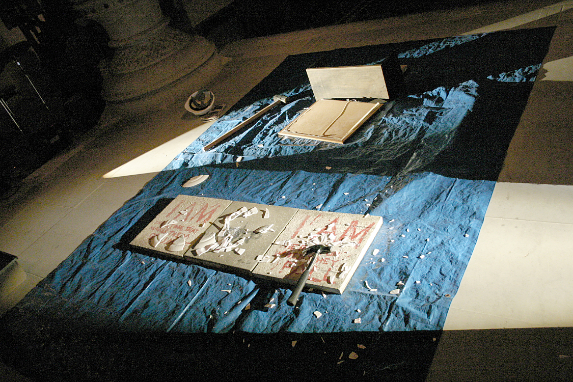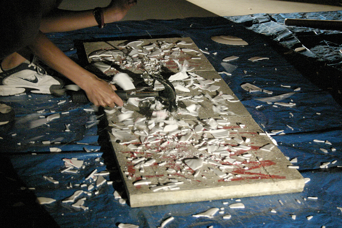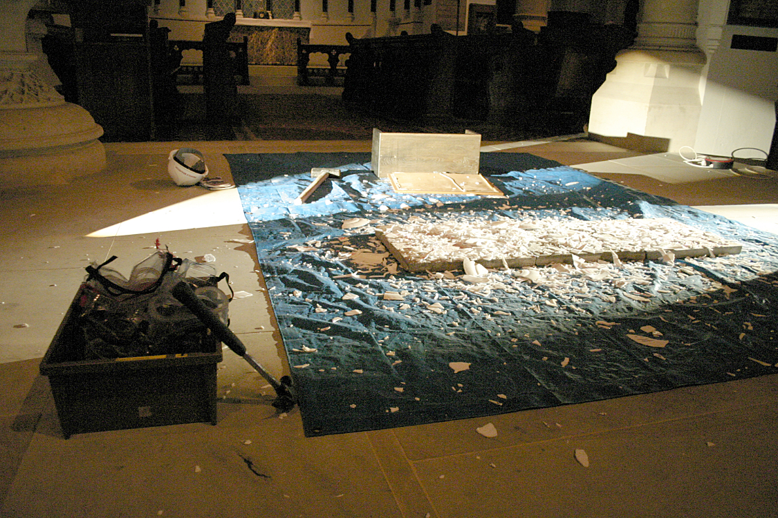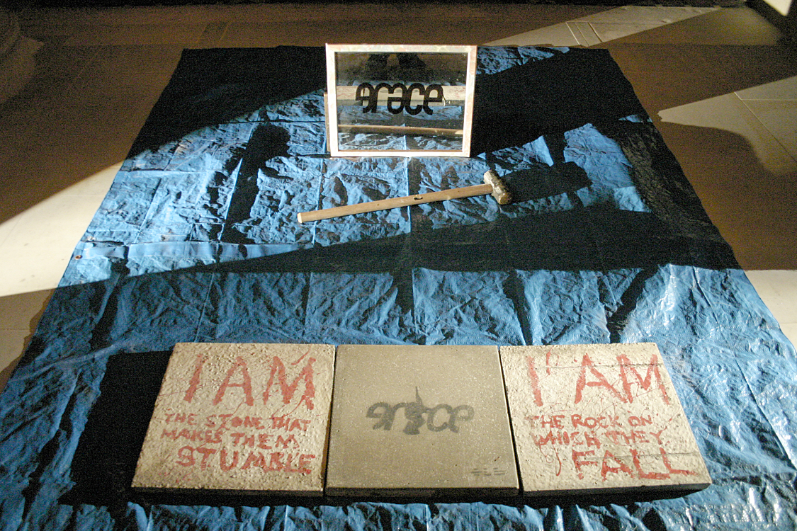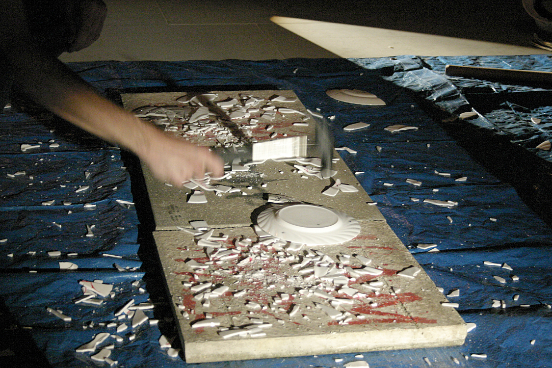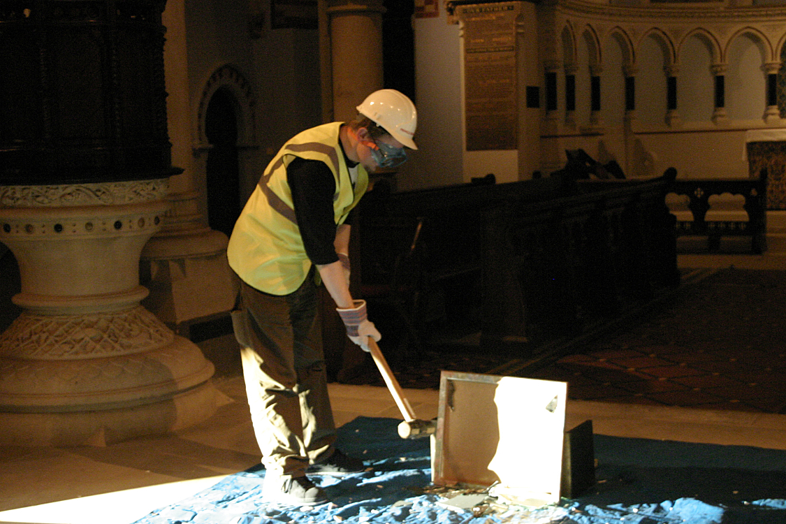 Now the congregation are invited to consider comforts that they want to move on from, or something dear that needs to be let go of. This could be personal or about Grace. They write it on a plate and smash it with a hammer on the concrete slabs. |