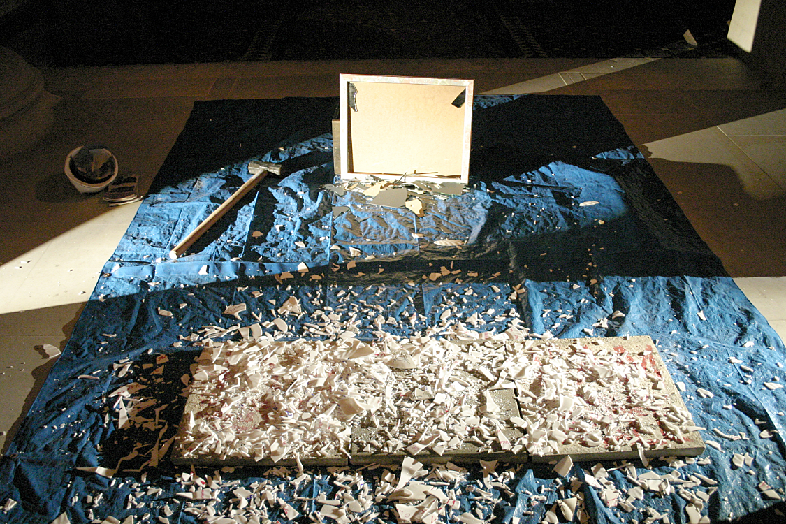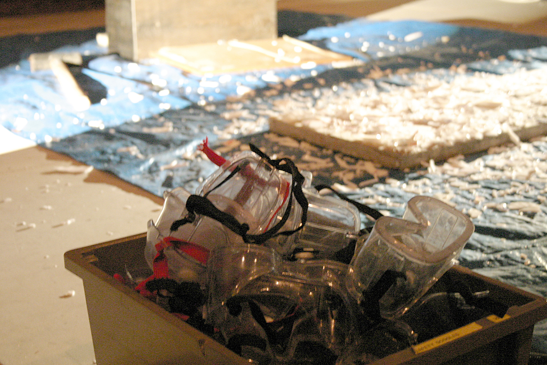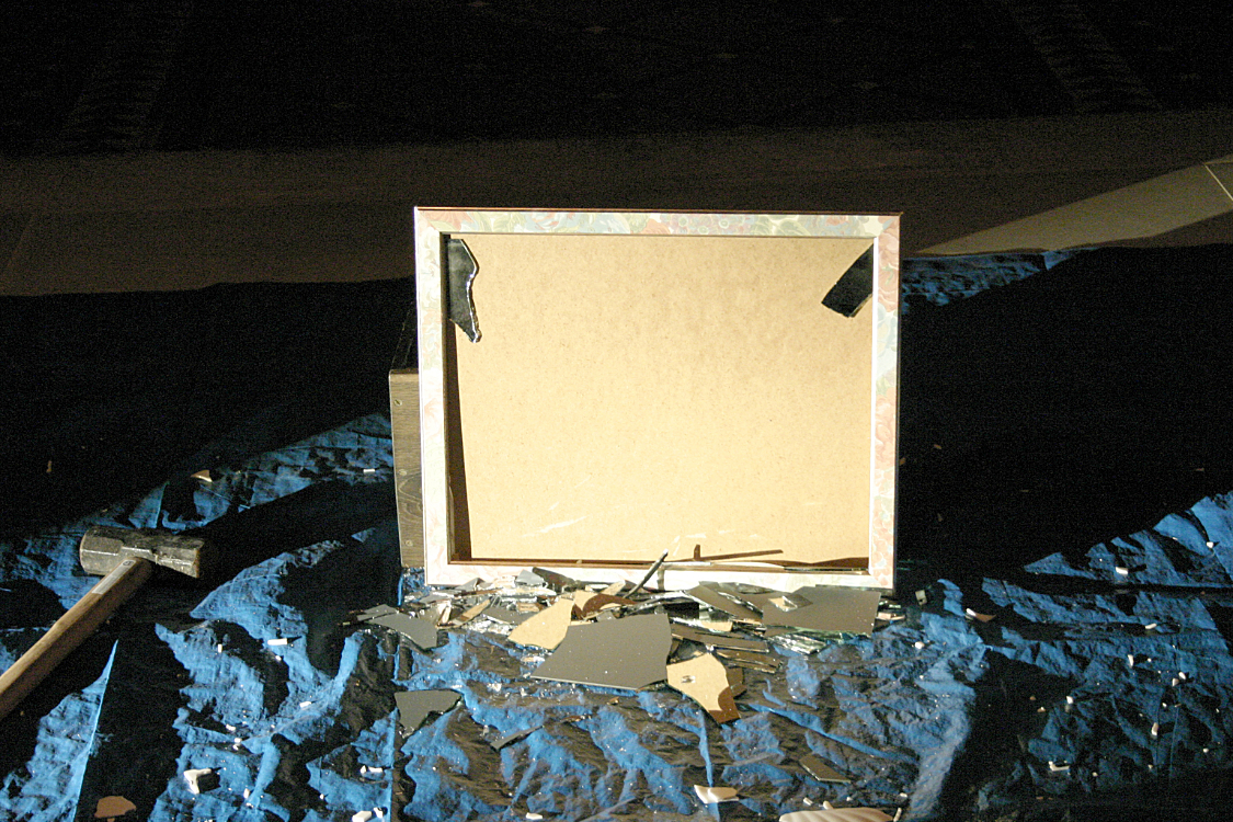Without explanation, I walk on and smash the Grace mirror with the sledgehammer. The PPE looks dramatic but the gloves and eye protection at least are necessary in case of flying glass. |