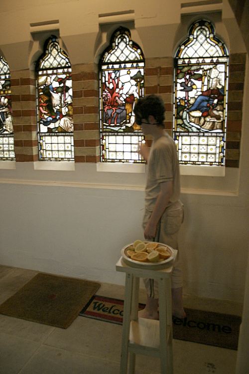 We cannot see the Spirit of God with our eyes, so we need to use different ways to sense the presence of the Spirit. The journey into the service is a blindfold, barefoot sensory walk, intended to awaken our senses other than sight. Kathy guides Ethan onto the start. |