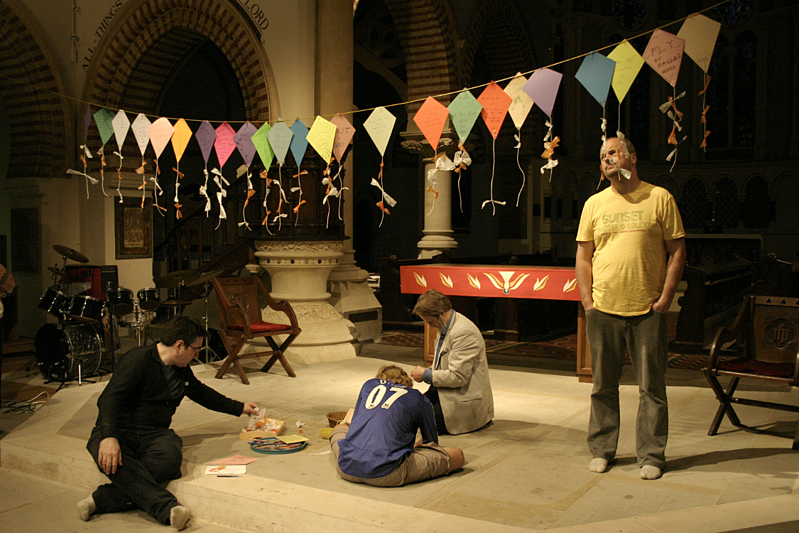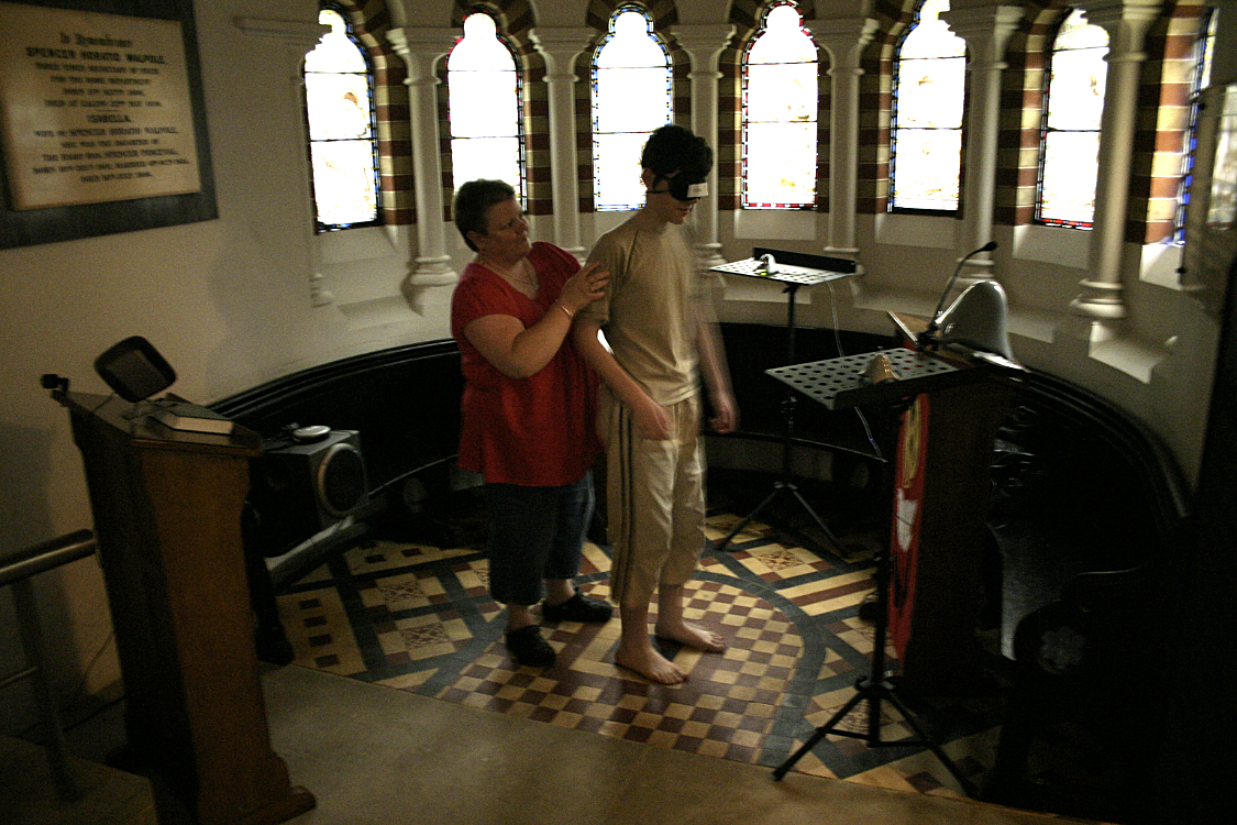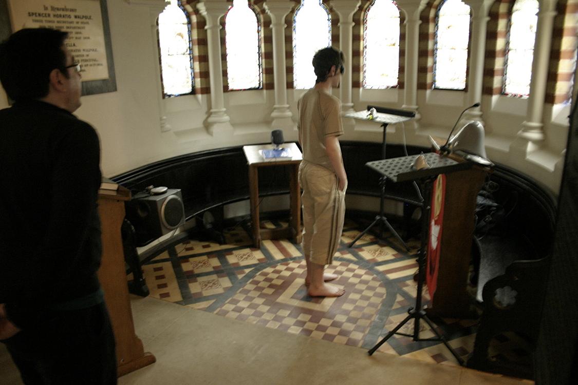 After a moment, Ben calls the walker's name, who then has to walk towards Ben guided by sound only. When they have emerged from the sound space the walker can take off the blindfold and join the rest of the congregation in the centre of the church. |