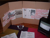 The Media station questioned how we receive and perceive news. Articles torn from newspapers and printed from the internet formed a backdrop to TV news footage - all documenting the same news story. An accompanying sheet questioned the nature of 'truth' in society and offered a ritual before leaving the station. |