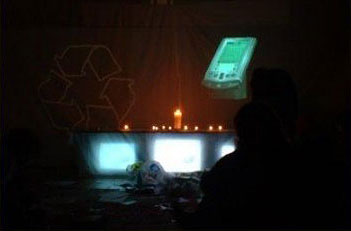 The altar was constructed from three TVs looping an image of a nondescript machine chugging away. Projected images also reflected the monotony of many peoples working lives. |