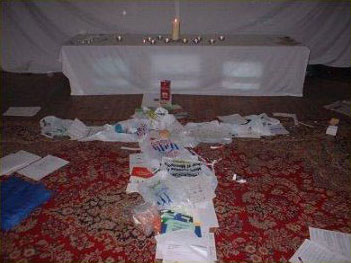 Towards the close of the worship the work stuff was formed into a cross, and wine and bread were retrieved from it to celebrate the eucharist. Everyone left the worship with a pay packet envelope containing wages, a 'please pray for' card containing the name and occupation of someone else who had been in the worship, a polaroid of someone at work with a prayer of thanks written on it, and some shredded rubbish. |