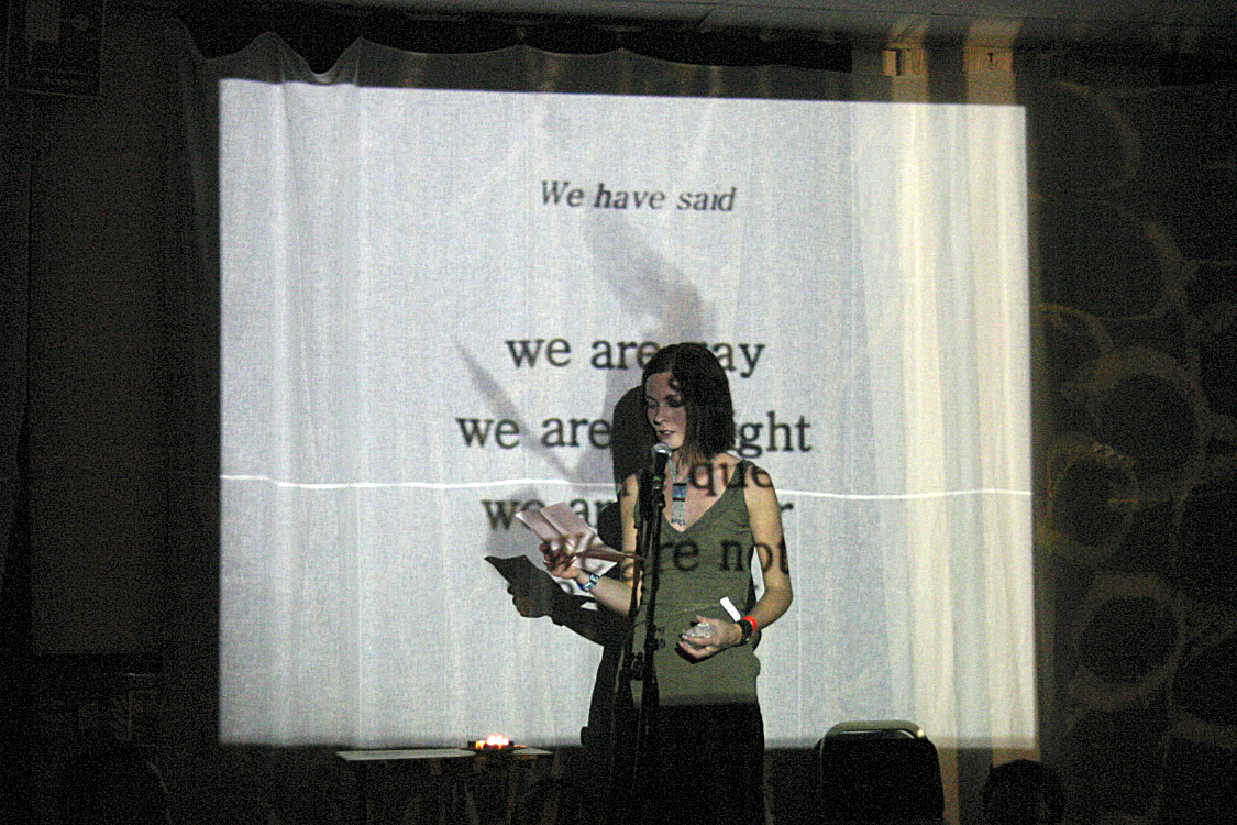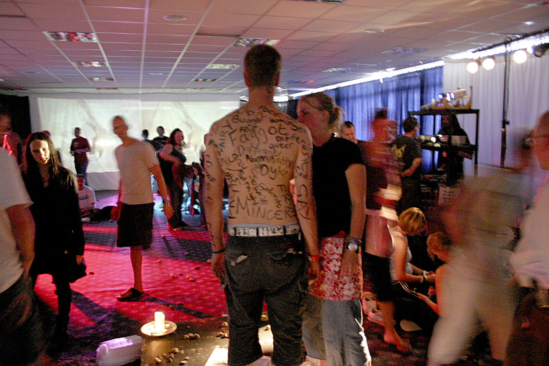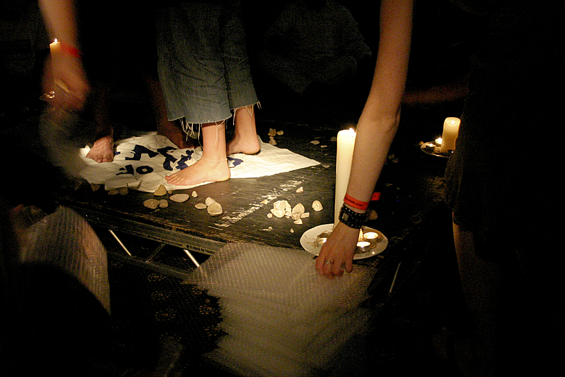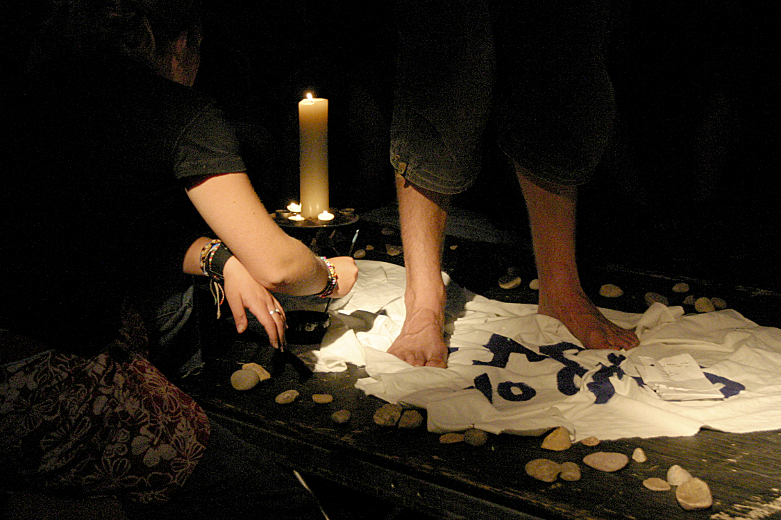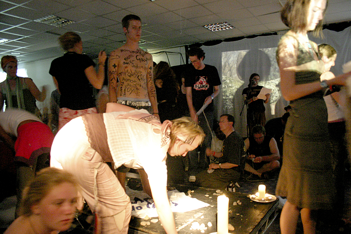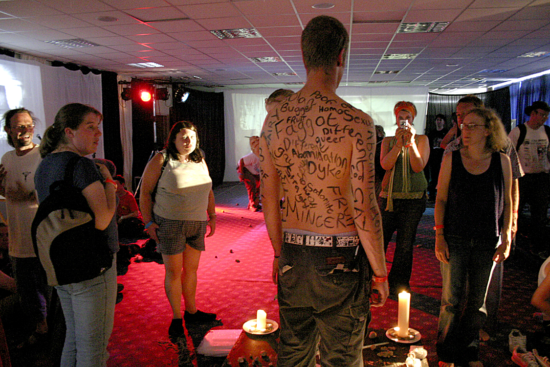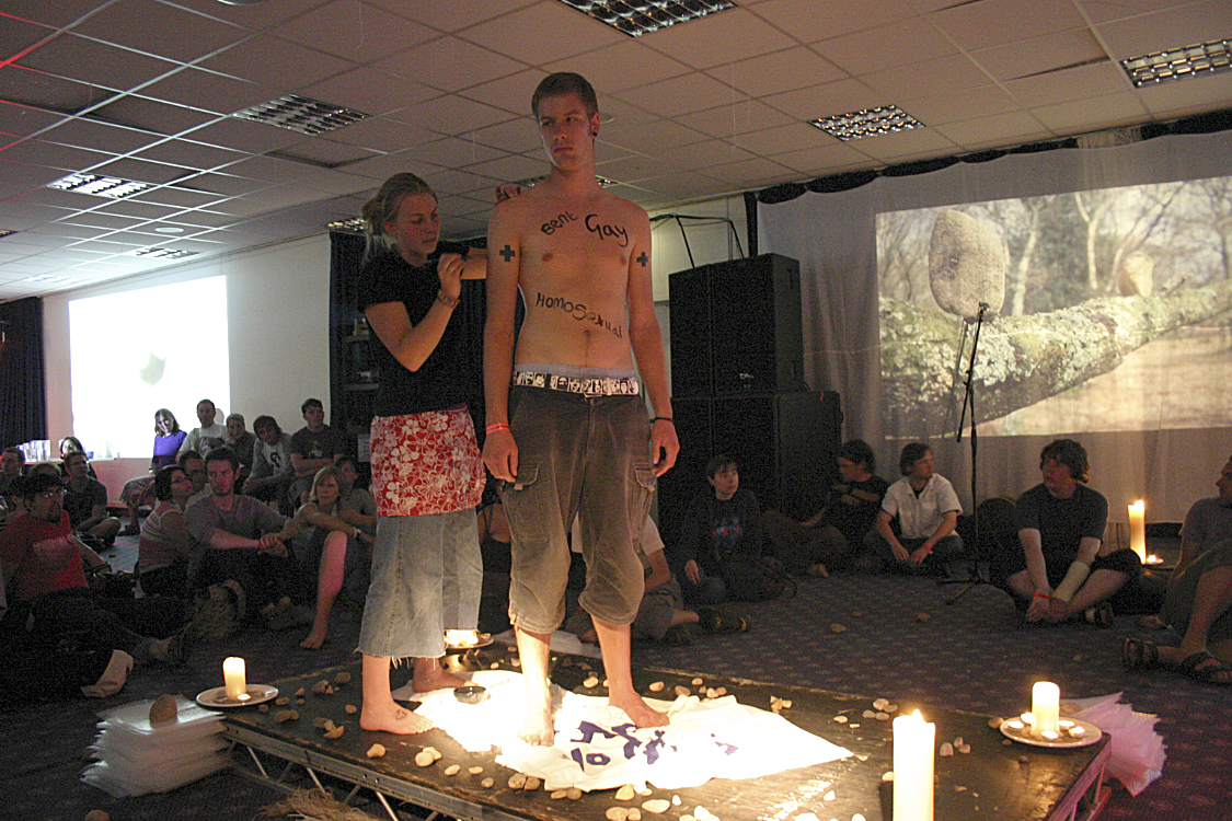 Instead of her usual canvas, the artist paints homophobic insults on the body of a young man. He stands motionless and she paints in silence, throughout the service. The floor of the entire room is scattered with stones, as if in preparation for a stoning. |