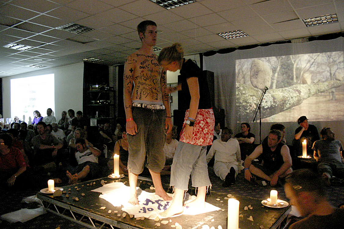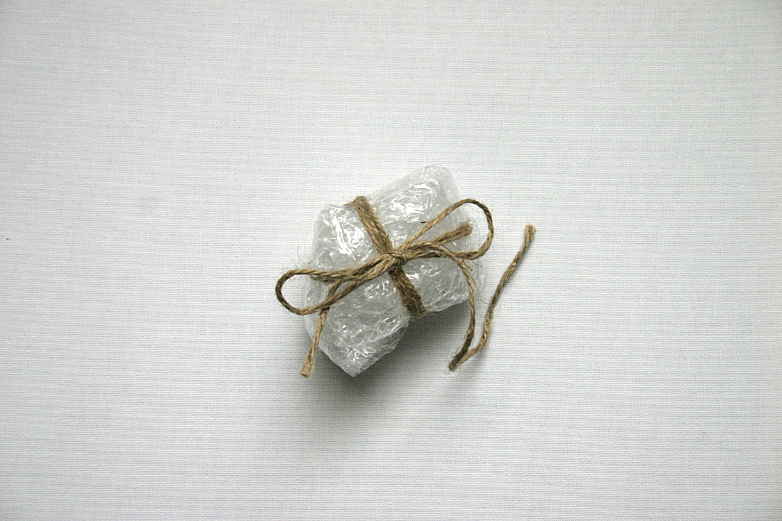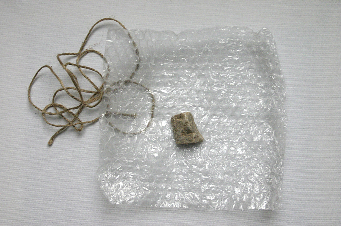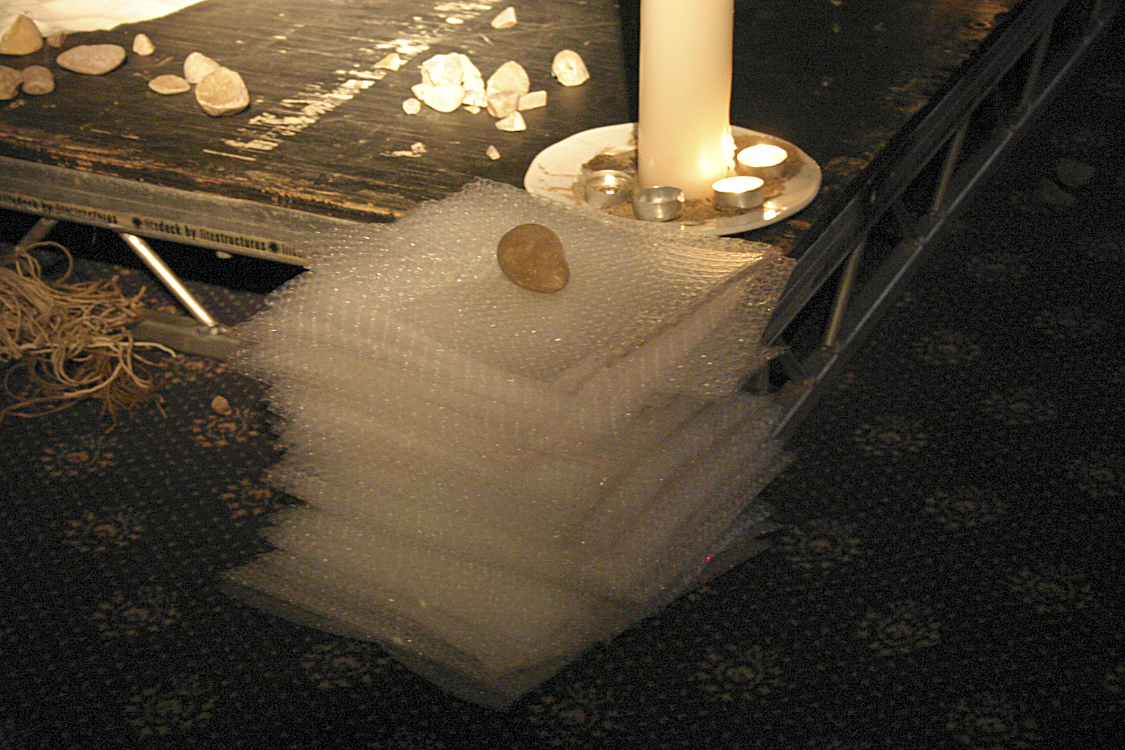 The stones scattered across the floor represent our judgements. At the corners of the podium are squares of bubblewrap and pieces of string. We take these and wrap a stone. |