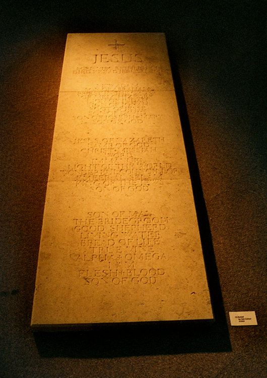 Station 12: 'Buried', by Iain Cotton. 'Buried' is about the final and desperate reality of Jesus' death, from before the resurrection. His epitaph is his names from the Bible which encompass what others hoped he would be and his claims and promises for himself. Jesus is lost to his people, lost to his followers and lost to his family. He is almost lost to our own time too [as if he never rose], like the forgotten saints marked by the tombstones we shuffle across in historic churches. Is there any hope here? See if you can find it among the names. |