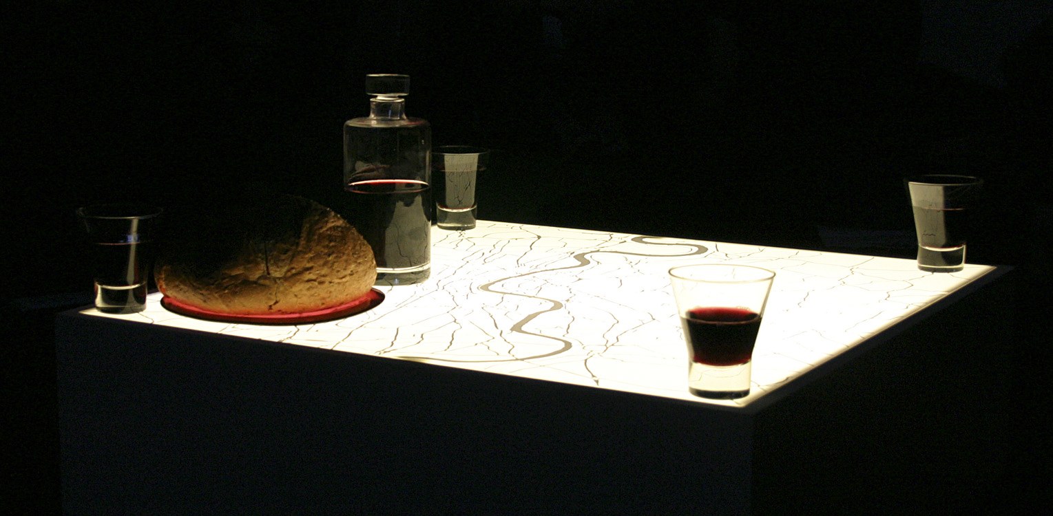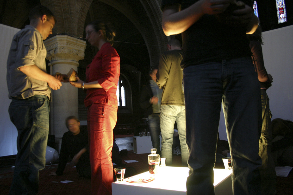 A person stands at each corner of the altar with bread and wine. Each person that receives takes the place of the person who gave, and gives in turn to the next person to approach. |